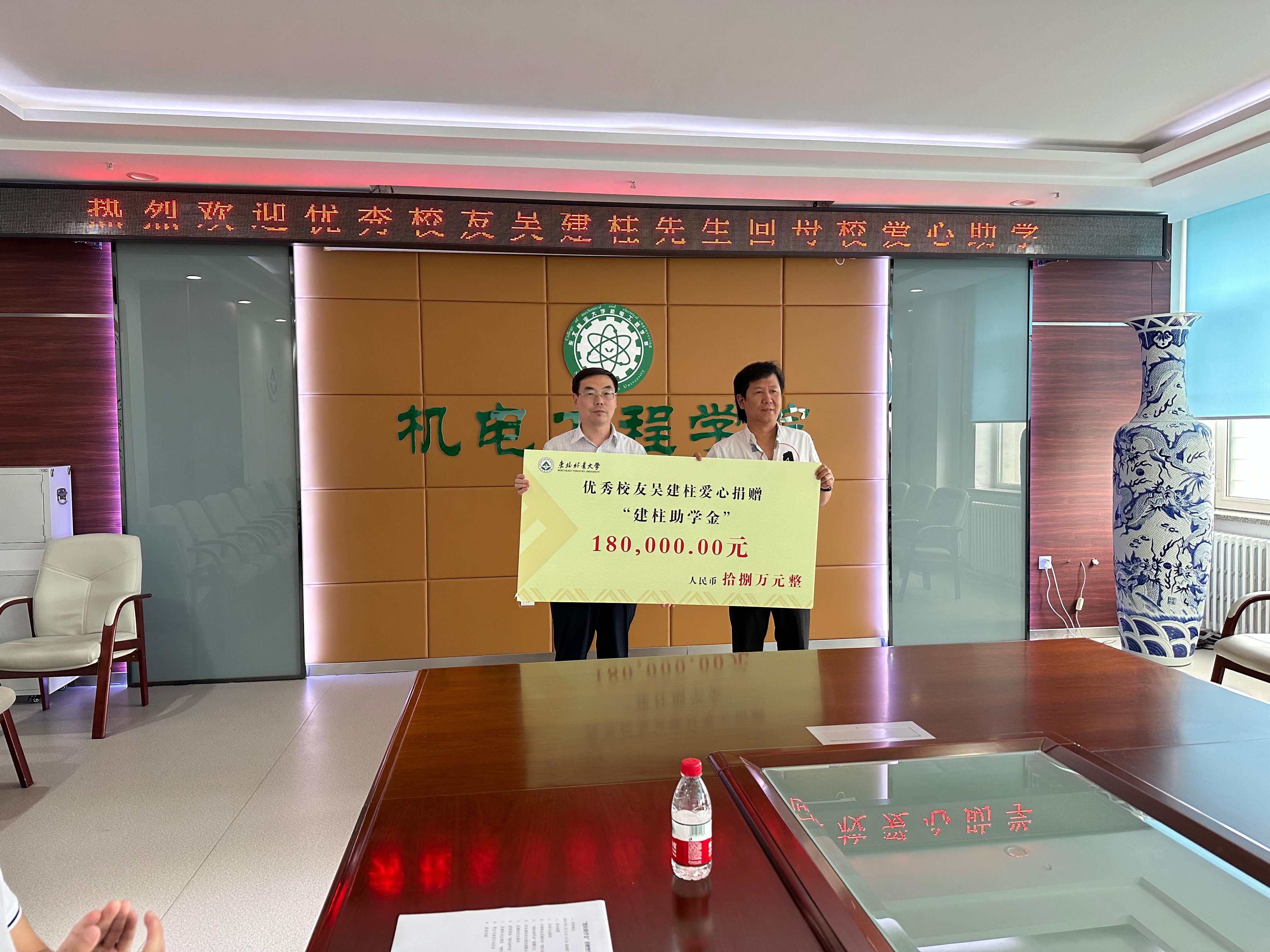 刘九庆院长简要介绍了校友吴建柱的基本情况和“建柱助学金”的设立初衷,代表学院接受了吴建柱先生18万元爱心助学款的捐赠,王佳彤书记向吴建柱先生颁发了捐赠证书。