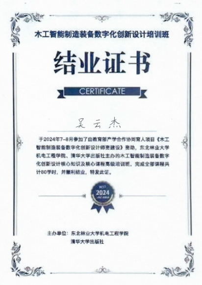 在教育部产学合作协同育人项目《木工智能制造装备数字化创新设计师资建设》师资培训项目的资助下,由万象城awcsport官网和清华大学出版社联合主办的木工智能制造装备数字化创新设计培训班顺利完成24位老师的培训工作,并颁发结业证书。