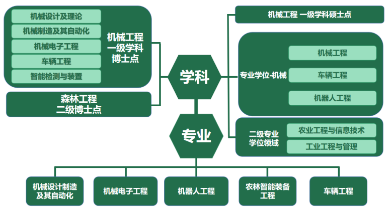 学院现有机械工程一级学科博士学位授权点,建有博士后科研流动站,为黑龙江省重点学科。拥有机械设计及理论、机械制造及其自动化、机械电子工程、车辆工程、自设方向智能检测与装置及林业工程(森林工程)6个博士学科方向;现有机械工程一级学科硕士学位授权点,拥有机械设计及理论、机械制造及其自动化、机械电子工程、车辆工程、林业工程(森林工程)5个学科方向。现有机械一个专业学位类别,拥有机械工程、车辆工程、机器人工程、农业工程与信息技术、工业工程管理5个专业学位领域。