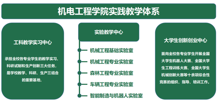 学院拥有我国唯一一个国家木工机械质量检验检测中心,拥有工科实习实训中心、国家级实验教学示范中心、国家级虚拟仿真实验教学中心、大学生创新创业中心等良好的办学条件和优秀的师资队伍。学院落实立德树人根本任务,始终秉承“提高质量、内涵发展”的办学理念,以“建设一流学科专业、培养一流工程人才”为目标,积极开展新工科建设、工程教育专业认证,培养学生创新创业能力。学院现有机械设计制造及其自动化、机械电子工程、车辆工程、农林智能装备工程、机器人工程5个本科专业。学院设有功能齐全的教学、科研及大学生创新中心,为创新型人才培养提供了良好的平台,学生在各类科技创新活动中屡获佳绩,人才培养质量得到了用人单位和社会的高度认可。