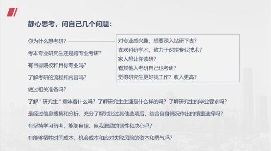 结尾,彭老师与大家分享了自身对于求学、就业及职业发展的看法,对学生常见问题进行分析。列举诸多案例,激励大家打开视野,拓展选项,正值假期时间较为充裕,认真思考总结,广泛搜集信息并做分析,结合自身情况再做慎重决定。确定好目标后,应尽快开始行动。