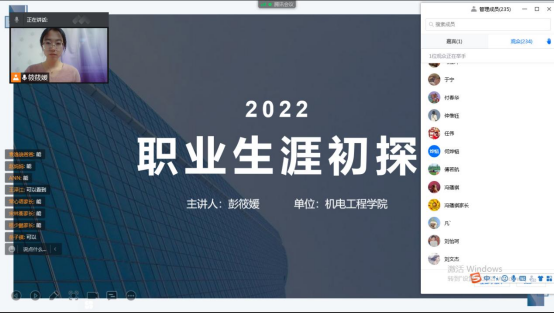 大二是大学学业生涯承上启下的关键阶段,同时是生涯发展探索和就业启蒙的重要时期。为更好帮助同学们规划职业生涯,明确发展目标,为就业做好准备,2022年2月12日晚18:30,万象城awcsport官网于腾讯会议举办大学生职业生涯探究专场培训会。2020级机械类、工业设计300余位学生及家长线上参会,培训由2020级辅导员彭筱媛主讲。