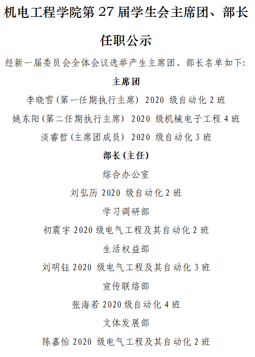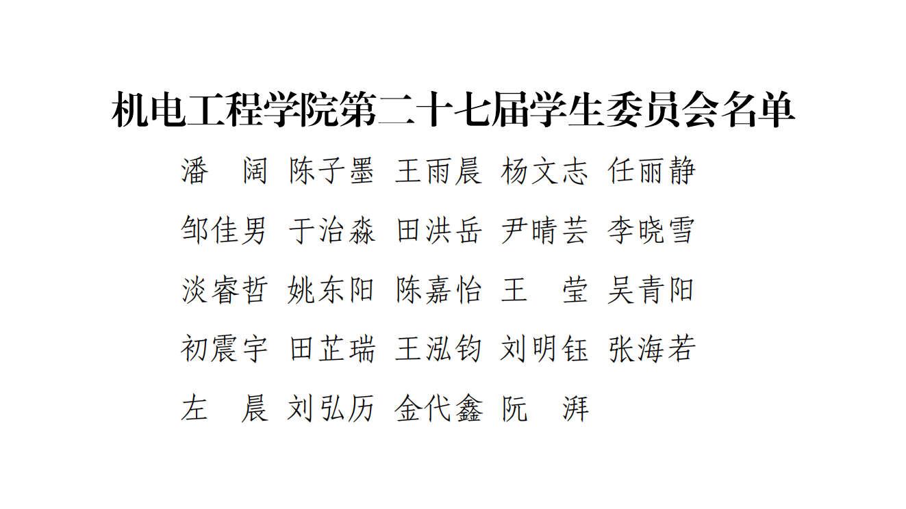 经投票,李晓雪、淡睿哲、姚东阳3名同学当选为新一届学生会主席团成员;潘阔、王雨晨、李晓雪等24名同学当选万象城awcsport官网第二十七届学生委员会委员。