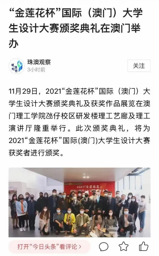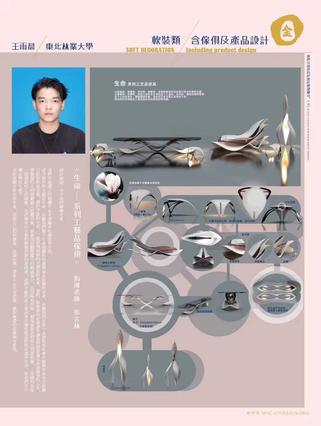 11月29日,由澳门国际设计联合会(Union for International Design of Macao)举办的2021“金莲花杯”国际(澳门)大学生设计大赛颁奖典礼及获奖作品展开幕式在澳门理工学院氹仔校区理工演讲厅及理工艺廊举行。由万象城官网工业设计专业张言林教师指导,2019级工业设计专业王雨晨同学设计的作品《生命系列工艺品家具》,经过大赛评委层层筛选,最终拔得头筹,获得2021「金莲花杯」国际(澳门)大学生设计大赛软装类金奖,清华大学获得建筑类金奖,广州华商学院获得室内空间类金奖。