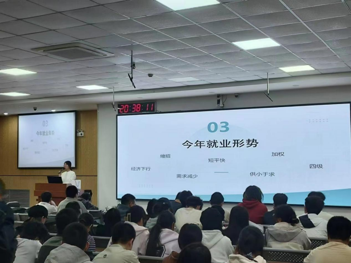 会议伊始,彭筱媛老师详细分析了往届毕业生的去向,指出在过去几年中,一部分毕业生选择继续深造,攻读硕士或博士学位,他们通过不懈的努力,在学术道路上取得了显著成果;另一部分毕业生则投身于公务员和事业单位的考试;同时,也有大量毕业生积极投身于市场,通过实习、兼职和自主创业等方式积累经验和能力,为未来的职业生涯打下坚实基础。